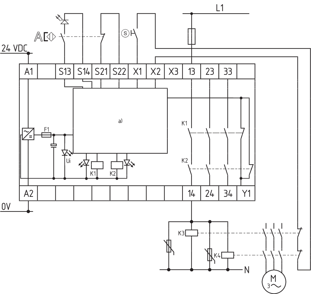Das Schaltungsbeispiel ist bei geschlossenen Schutzeinrichtungen und im spannungslosen Zustand dargestellt. Überwachung von 1 Schutzeinrichtung(en) mit je einem magnetischen Sicherheits-Sensor der Reihe BNS Der Rückführkreis überwacht die Stellung der Schütze K3 und K4. Zur Absicherung einer Schutzeinrichtung bis zu PL e und Kategorie 4 Automatischer Start: Die Programmierung auf automatischen Start erfolgt durch die Einbindung des Rückführkreises an die Klemmen X1/X3. Bei nicht benötigtem Rückführkreis ist dieser durch eine Brücke zu ersetzen. Start-Taster (S) mit Flankendetektion |