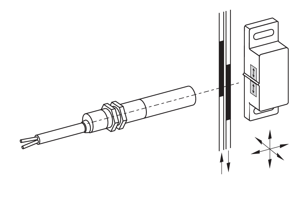 Schaltabstand bis zu 55 mm, abhängig vom Betätigungsmagnet und Ausführung. Die Angaben zu den Schaltabständen gelten bei Betätigung einzeln montierter Geräte ohne ferromagnetischen Einfluss. Eine Veränderung des Abstandes, positiv wie negativ, ist durch ferromagnetischen Einfluss möglich. Bei der Anordnung von mehreren Betätigungsmagneten ist die gegenseitige Beeinflussung zu berücksichtigen. |