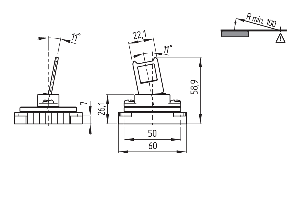 Drehpunkt des Scharniers und Oberkante des Sicherheitsschalters zuzüglich 52,7 mm müssen eine Ebene bilden Betätigungsradius einstellbar bis minimal 100 mm mit einem Innensechskant-Schlüssel SW 2 mm kleinstmöglicher Betätigungsradius bei drehbaren Schutzeinrichtungen über die breite Seite des Betätigers 100 mm |