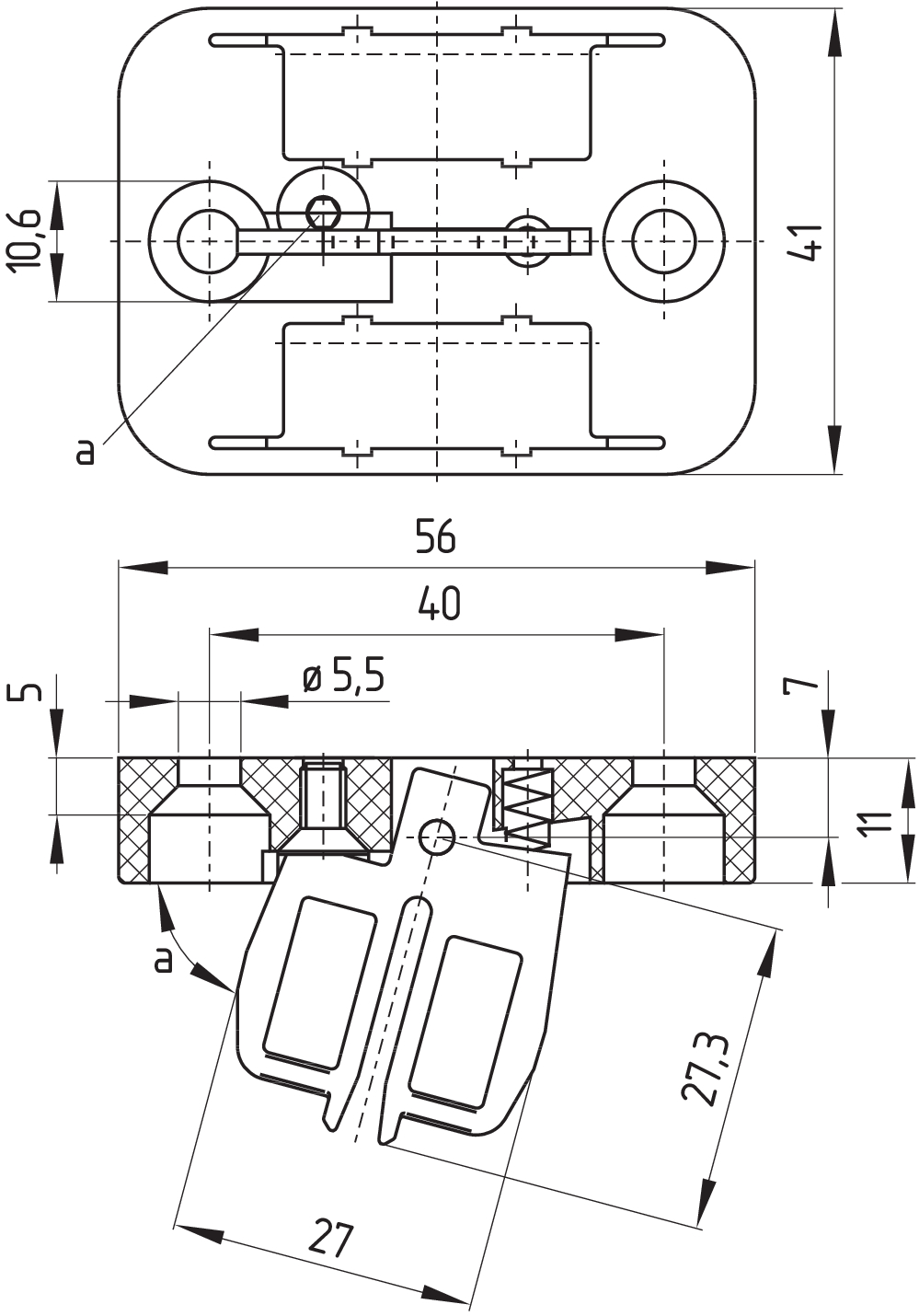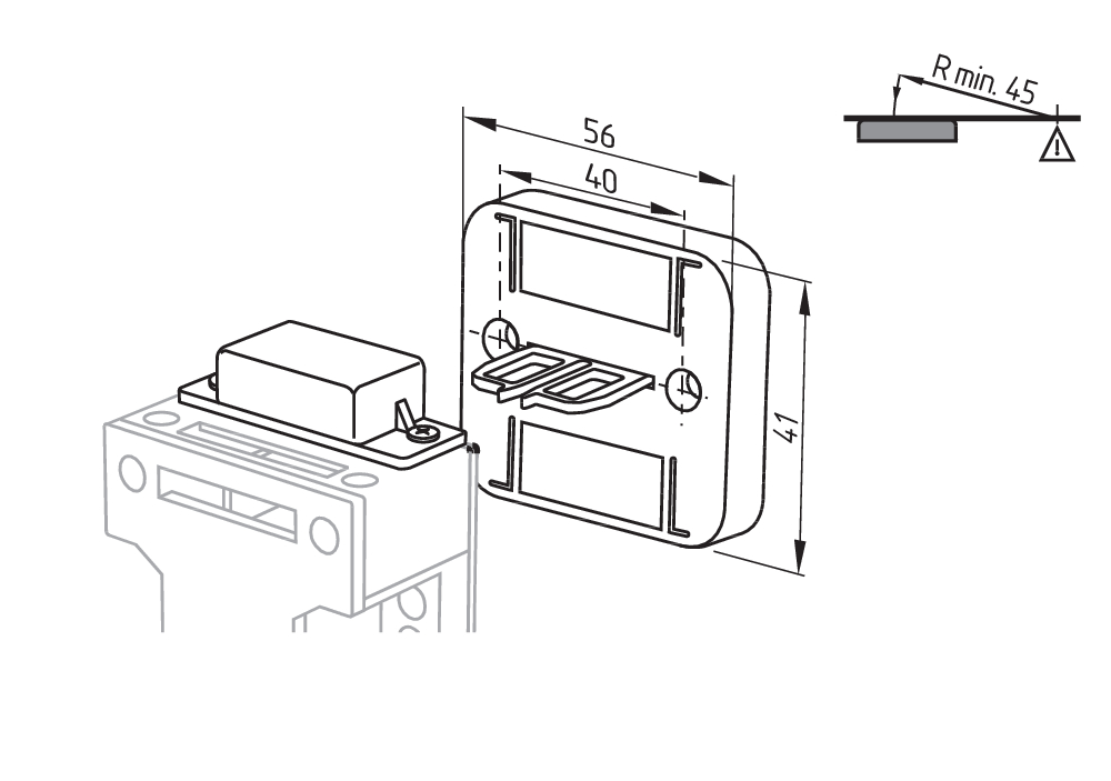 The axis of the hinge must be 11 mm above and in a parallel plane to the top surface of the safety switch. Actuating radius adjustable to minimum 45 mm using a hexagonal key wrench AF 2.5 mm (a) |