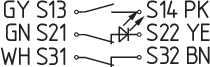 Diagrama mostrando os símbolos dos contatos fechados no dispositivo de segurança A atribuição dos contatos nas versões com ou sem LED é idêntica. |